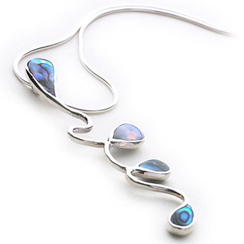 Design talent always catches the eye, and this organic squiggle of exotic droplets, set with abalone shell, is a real head turner. Add a plunging halter neck top in contrasting violet for a dramatic leap across the colour wheel. Size: 62x14mm. Includes: 40cm snake chain.